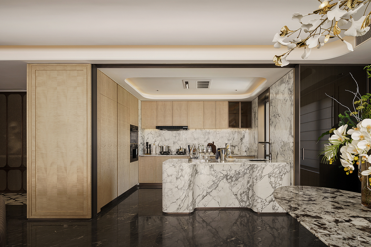 高端入户子母门,奢华铺面而来;穿过玄关后,映入眼帘的是约7.9米开间客厅、中西双厨系统、搭配岛台的餐厅,嵌入式定制厨房家居,形成客餐厨一体化,空间豁然开朗,不管是天伦之乐,还是宴请朋友、洽谈商务,尽显生活的尺度感与霸气感。